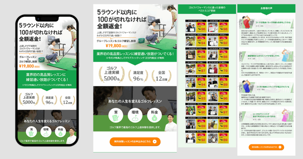 課題制作-3 投稿日: 2025年8月23日2025年8月25日 投稿者: mutsuki 2025.06作成 課題で制作した、初めてのランディングページです。 使用ツール:Photoshop、WIX ▼前提条件・ゴルフ練習スタジオへの誘導・50代~60代男性ゴルファー向け・無料体験レッスンからバックエンドオファー・スタジオのリアルな様子を伝えるため、「リアルな写真」を使用する。